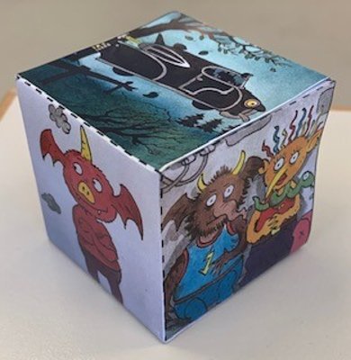Es werden Kleingruppen (max. 3 Kinder) gebildet, die zu einem vorgegebenen Thema (Dinosaurier, StarWars, Pferde, Märchen, etc.) einen Themenwürfel erstellen. Jedes Kind darf seinen Würfel mit nach Hause nehmen. Je nach Zeitfenster können sich die Kinder nun Geschichten über das Buch erzählen. Es darf auch getauscht werden. So entstehen lustige Gespräche.